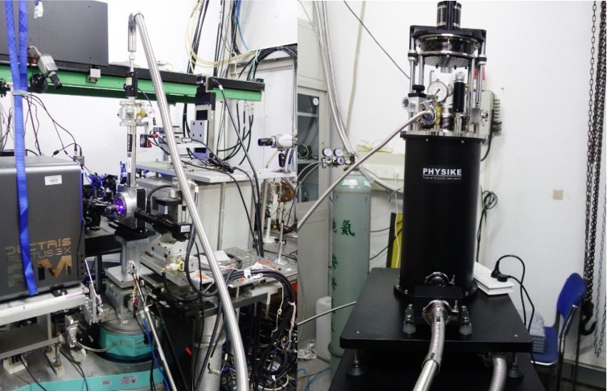 匹配日本理學(xué)X-ray衍射儀(Rigaku NANOPIX WE)的高壓低溫系統(tǒng)(Qcryo-S-300),內(nèi)部集成金剛石對頂壓機(jī)和雙氣膜原位調(diào)壓機(jī)構(gòu),最低溫度小于2.5K(右圖)