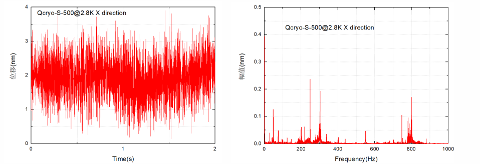 下圖是Qcryo-S-500干式低溫恒溫器在X方向振動(dòng)位移時(shí)域和FFT變換頻譜。在X方向振動(dòng)水平(峰峰值):<4nm, FFT變換頻譜 (0-1000Hz) 的最大振幅:<0.4nm。