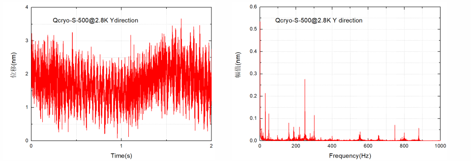下圖是Qcryo-S-500干式低溫恒溫器在Y方向振動(dòng)位移時(shí)域和FFT變換頻譜。在Y方向振動(dòng)水平(峰峰值):<4nm, FFT變換頻譜 (0-1000Hz) 的最大振幅:<0.6nm。