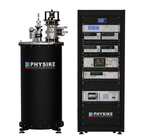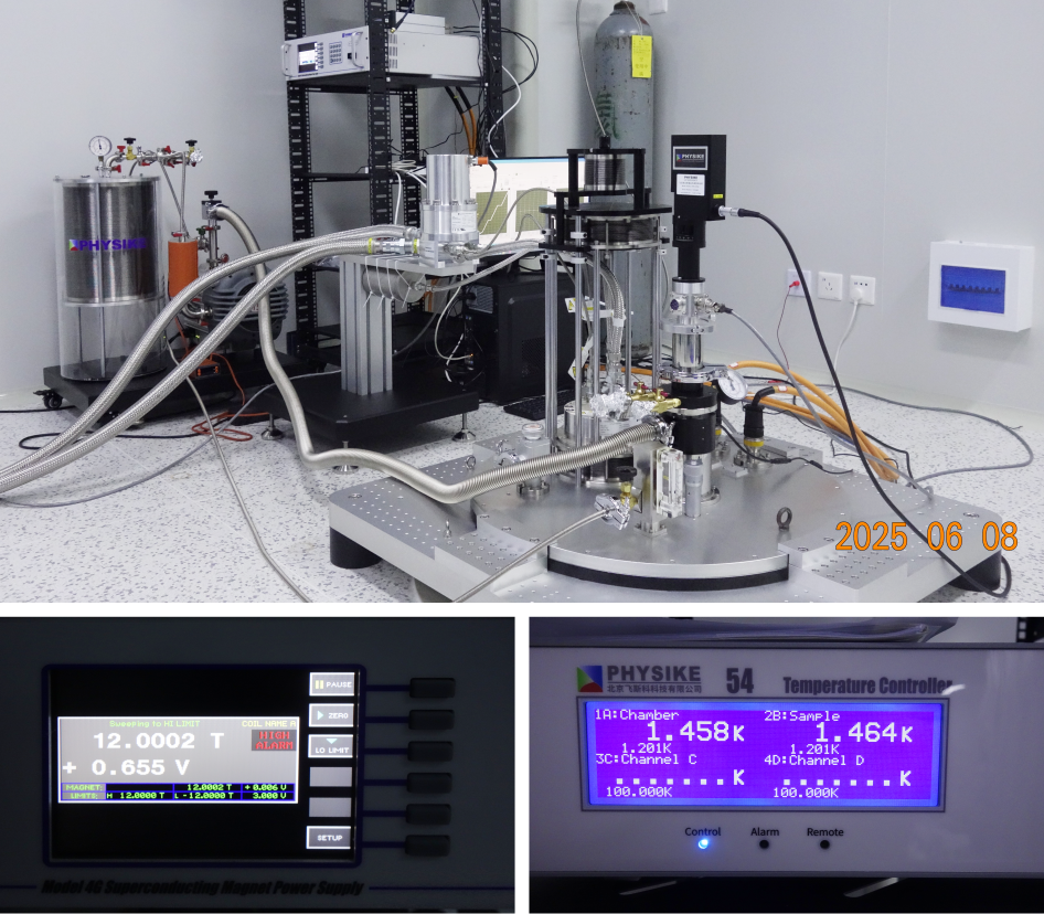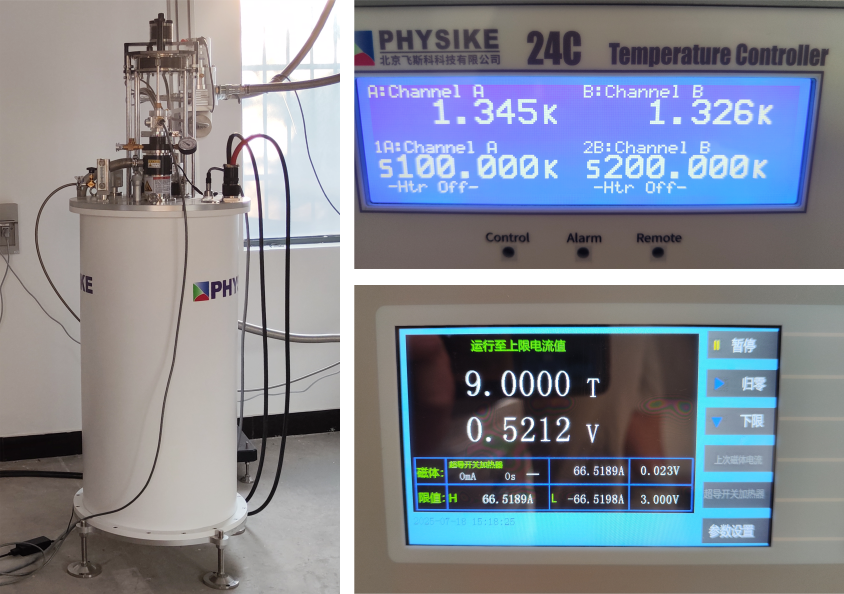 1、采用GM制冷機(jī)作為冷源,冷頭懸浮減震設(shè)計(jì),靜態(tài)交換氦氣環(huán)境,樣品管內(nèi)徑50mm,最低溫度<1.35K,最高磁體強(qiáng)度為9T,提供兼容金剛石對(duì)頂壓機(jī)的高壓樣品桿。該測(cè)試系統(tǒng)提供低溫強(qiáng)磁場(chǎng)高壓電磁輸運(yùn)、Hall測(cè)試等測(cè)試模塊,并提供多路測(cè)試開(kāi)關(guān),允許同時(shí)測(cè)試多個(gè)常壓樣品。此外,該系統(tǒng)還提供馬達(dá)驅(qū)動(dòng)的高壓旋轉(zhuǎn)樣品桿。