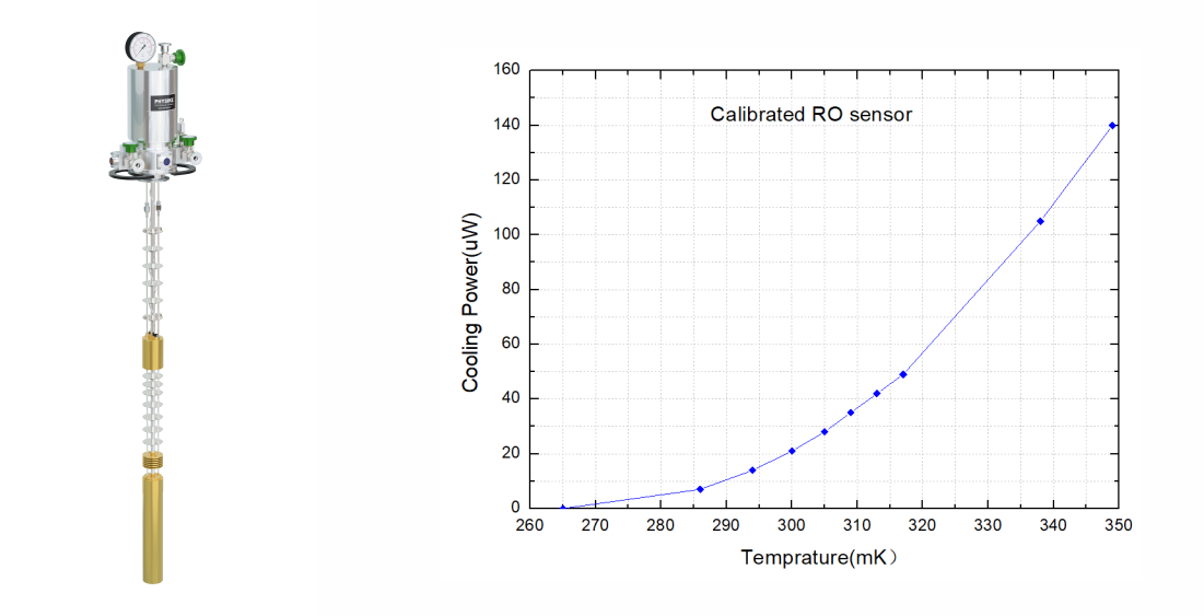 典型He-3插件(左圖);典型He-3插件制冷量與溫度關(guān)系(右圖)