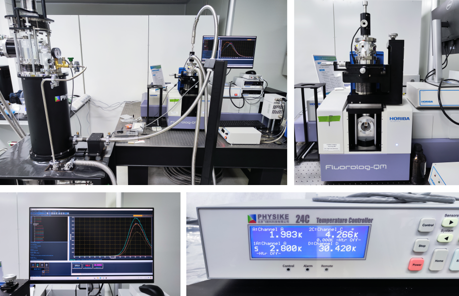 其中S-100-XYZ低溫恒溫器為連續(xù)流型低溫恒溫器,集成三維線性位移臺允許在低溫下對樣品進行位置調(diào)節(jié),該恒溫器的尾部插入Fluorolog-QM光譜儀的樣品倉,合適的倉蓋有效地阻止雜散光對實驗的影響。